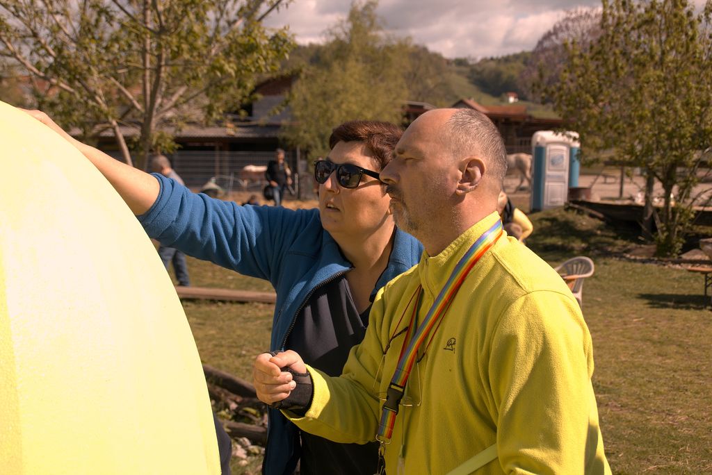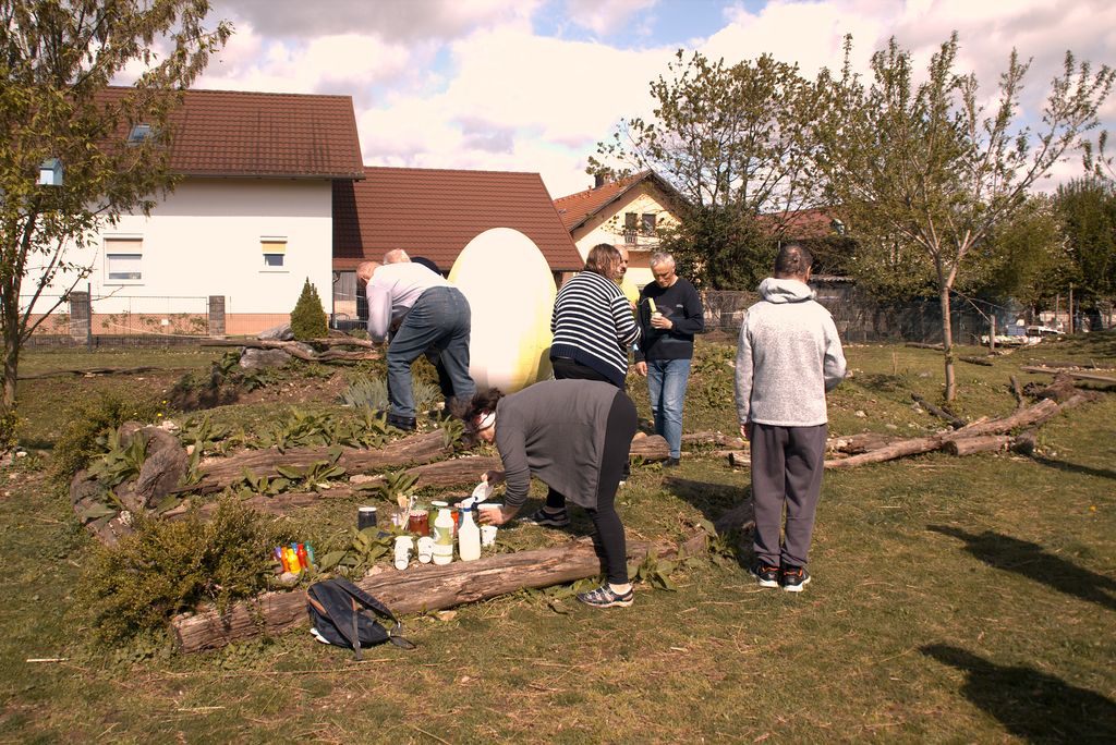 Na velikonočno soboto pa smo za otroke in varovance Doma Nine Pokorn Grmovje pripravili velikonočno barvanje jajčk. Ta dan nam je bilo vreme naklonjeno, sonček je udeležence grel na poligonu društva, kjer so barvali ogromna dinozavrova jajca. Seveda ni manjkalo nojevih jajc, pripravili pa smo tudi 200 kokošjih jajčk, ki so jih lahko starši in otroci po barvanju odnesli domov. Najbolj veselo pa je bilo druženje z osličkom Olijem in kozličkom Čikom, ki sta popestrila njihovo ustvarjalno soboto.