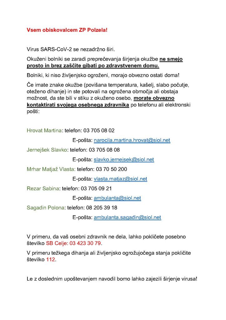 Če imate znake okužbe (povišana temperatura, kašelj, slabo počutje, oteženo dihanje) in ste potovali na ogrožena območja ali obstaja možnost, da ste bili v stiku z okuženo osebo, morate obvezno kontaktirati svojega osebnega zdravnika po telefonu ali elektronski pošti: