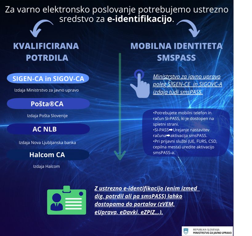 Tako kot pri poslovanju v fizičnem svetu svojo istovetnost dokazujemo z osebnim dokumentom, tako pri elektronskem poslovanju to storimo s kvalificiranim digitalnim potrdilom ali mobilno identiteto smsPASS. To potrebujemo za varno elektronsko poslovanje z državnimi organi kot ustrezno sredstvo za e-identifikacijo. Na ta način izkazujemo svojo identiteto, jamčimo za vsebino elektronsko posredovanih informacij in se tudi elektronsko podpisujemo.