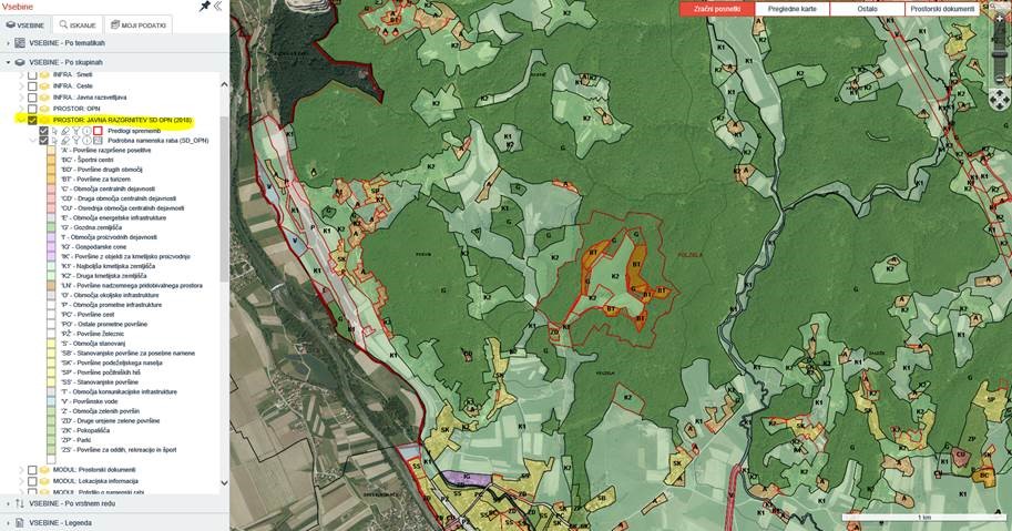 - V mapi PROSTOR: JAVNA RAZGRNITEV SD OPN (2018) izberete Predlogi sprememb in Podrobna namenska raba (SD_OPN).