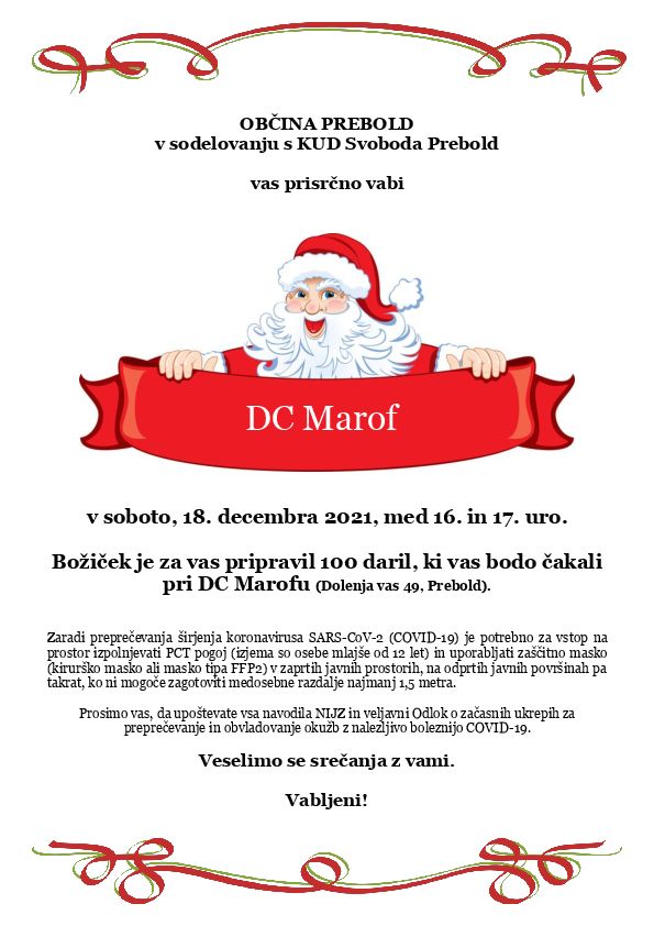 Prisrčno vabljeni v soboto, 18. decembra 2021 med 16. in 17. uro na dvorišče DC Marof v Dolenji vasi 49, kjer bo Božiček pripravil darila za najmlajše.