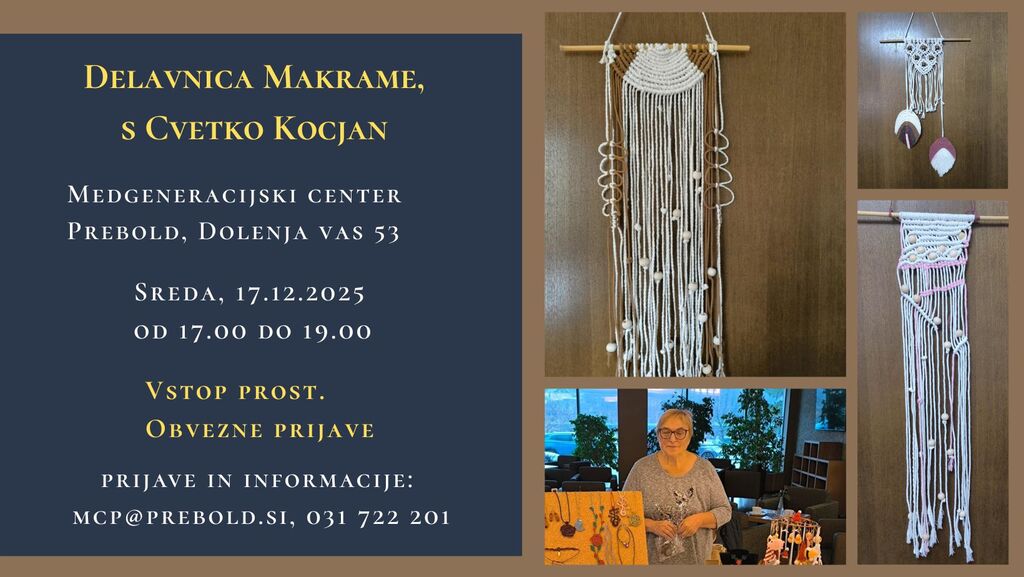 Prisrčno vabljeni, da se nam pridružite in popoldne preživite v ustvarjanju, druženju in prijetni decembrski energiji. Skupaj bomo spletli nekaj lepega, iz vrvic in iz trenutkov.