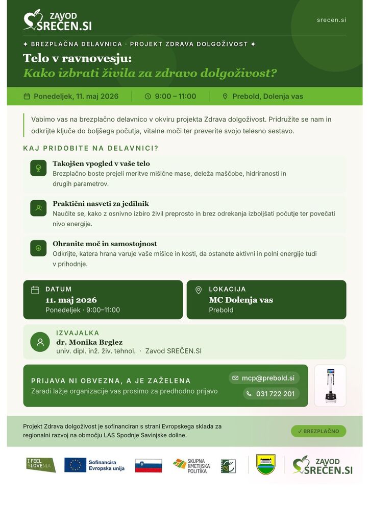 Vabimo vas na brezplačno delavnico v okviru projekta Zdrava dolgoživost. Pridružite se nam in odkrijte ključe do boljšega počutja, vitalne moči ter preverite svojo telesno sestavo.