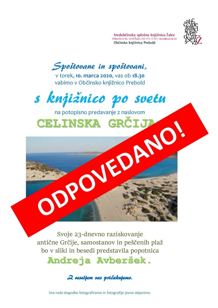 v torek, 10. marca 2020, vas ob 18.30 vabimo v Občinsko knjižnico Prebold s knjižnico po svetu na potopisno predavanje z naslovom CELINSKA GRČIJA.