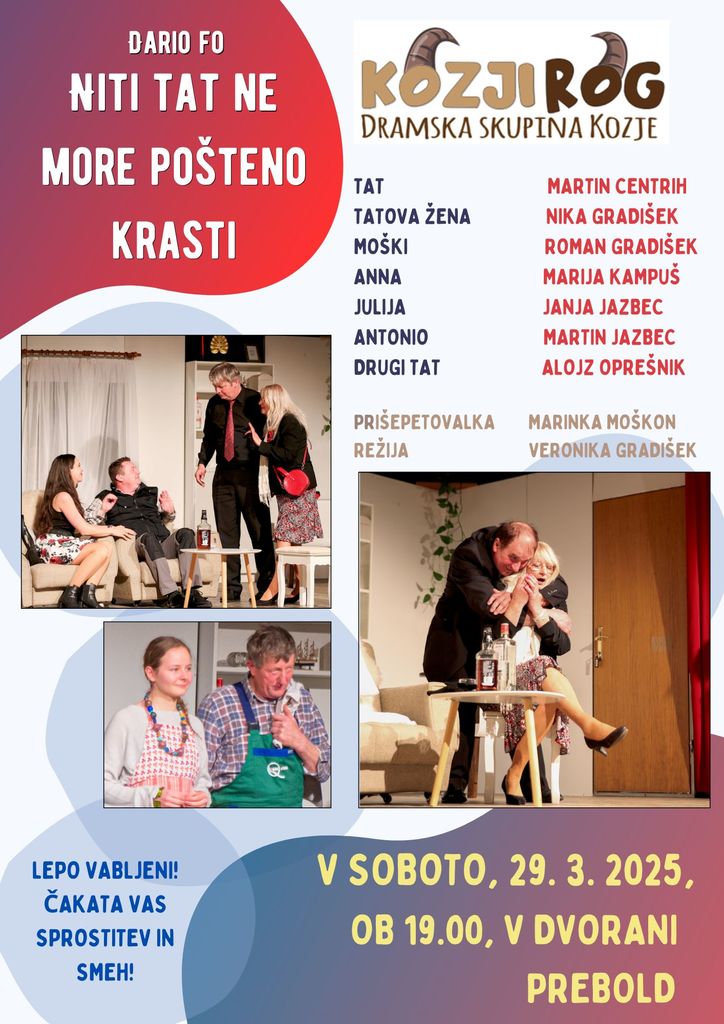 Vabljeni na ogled komedije "NITI TAT NE MORE POŠTENO KRASTI", v izvedbi dramske skupine KOZJI ROG iz Kozjega. Skozi napeto dogajanje v igri, se postopno odstirajo laži in prikrite resnice. Pri čemer se pokažeta hinavščina in oportunost bogatejših, kar gledalca pripravi do tega, da na koncu navija za čisto navadnega tatu. Igra je polna zapletov in nesporazumov, zabavnih dovtipov in besednih iger.