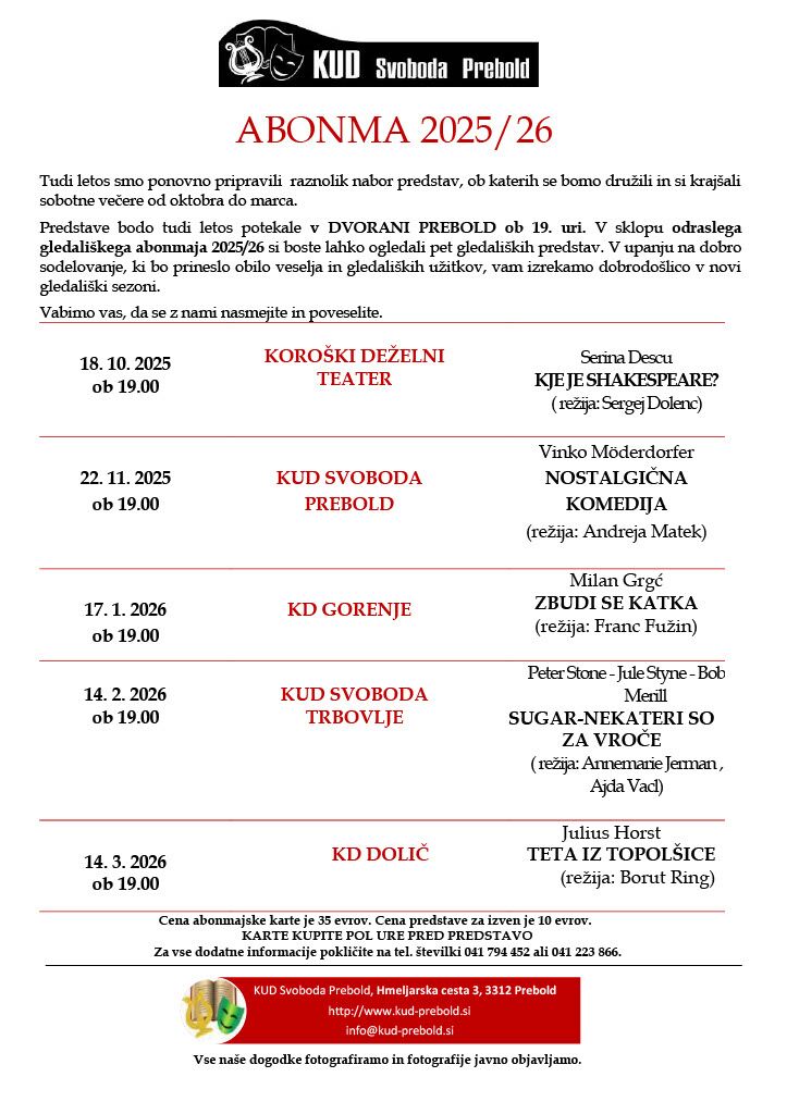 Tudi letos smo ponovno pripravili raznolik nabor predstav, ob katerih se bomo družili in si krajšali sobotne večere od oktobra do marca. Predstave bodo tudi letos potekale v DVORANI PREBOLD ob 19. uri. V sklopu odraslega gledališkega abonmaja 2025/26 si boste lahko ogledali pet gledaliških predstav. V upanju na dobro sodelovanje, ki bo prineslo obilo veselja in gledaliških užitkov, vam izrekamo dobrodošlico v novi gledališki sezoni.
