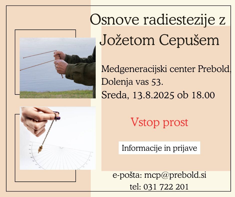 Vabljeni na zanimivo in poučno predavanje Jožeta Cepuša, ki nam bo odprl vrata v svet radiestezije – starodavne metode zaznavanja energij, ki jo danes mnogi uporabljajo za iskanje vodnih žil, preverjanje energije prostora, pa tudi za vpogled v osebno počutje.