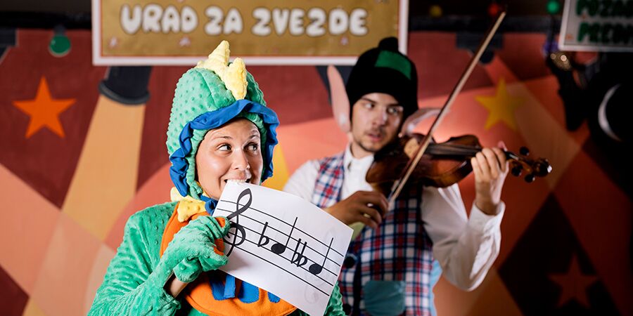 Škrat Toni je škrat dobrega srca, zato se odloči mladičku pomagati, ne da bi vedel, da Dino v kovčku skriva tisto, kar sam išče že vse svoje škratje življenje. Ne pomaga pa le Toni. Na pomoč priskočijo tudi otroci iz publike, saj lačni Dino ne pozna čudnih predmetov (glasbil), ki jih sreča na Uradu za zvezde. Ker pa je že od časa dinozavrov tako, da se dobro z dobrim poplača, ima tudi mali Dino na koncu za vsakega od nas prav posebno presenečenje.