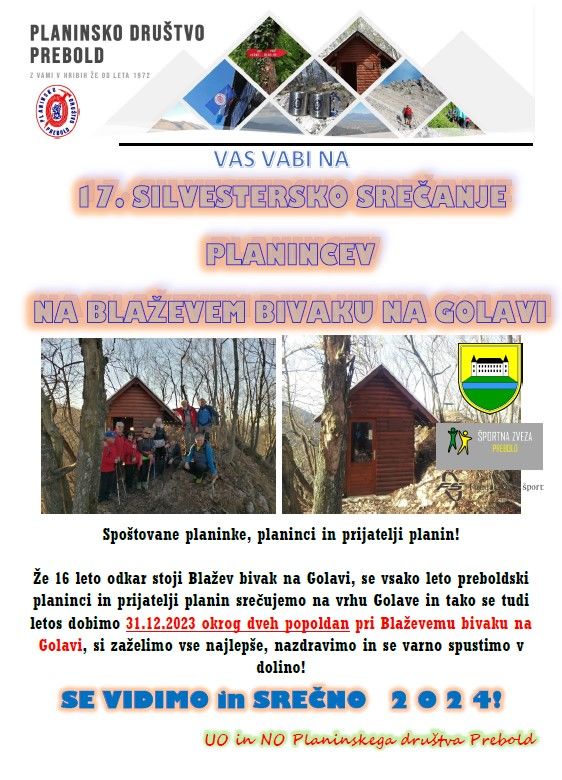 Že 16 leto odkar stoji Blažev bivak na Golavi, se vsako leto preboldski planinci in prijatelji planin srečujemo na vrhu Golave in tako se tudi letos dobimo 31.12.2023 okrog dveh popoldan pri Blaževemu bivaku na Golavi, si zaželimo vse najlepše, nazdravimo in se varno spustimo v dolino!