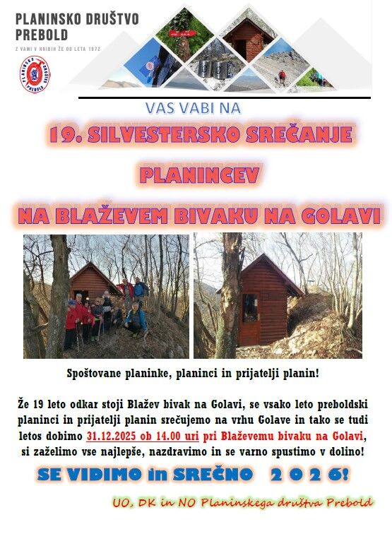 Že 19 leto odkar stoji Blažev bivak na Golavi, se vsako leto preboldski planinci in prijatelji planin srečujemo na vrhu Golave in tako se tudi letos dobimo 31.12.2025 ob 14.00 uri pri Blaževemu bivaku na Golavi, si zaželimo vse najlepše, nazdravimo in se varno spustimo v dolino!