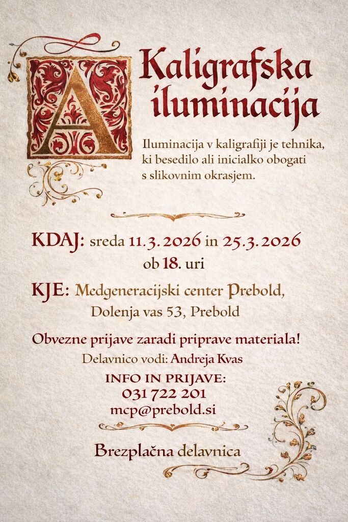 V sredo, 11. 3. 2026 in 25. 3. 2026 ob 18.00 bomo prvo črko svojega imena ali priimka okrasili v čudovito kaligrafsko iluminacijo – osebni simbol, ki lahko postane lep spomin ali darilo.