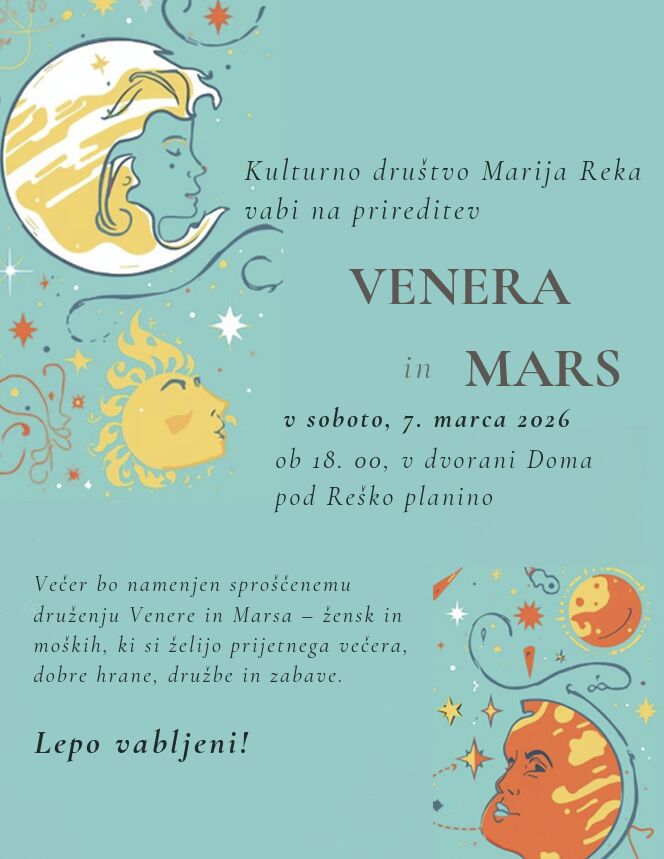 Kulturno društvo Marija Reka vabi na prireditev Venera in Mars, ki bo v soboto, 7. marca ob 18. uri v Domu pod Reško planino.