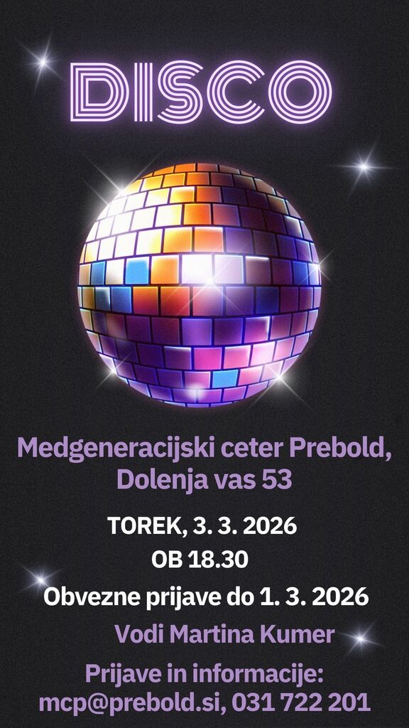 Zaradi spremembe termina vas obveščamo, da bo disco večer potekal 3. 3. 2026 (ne 4. 3. 2026, kot je bilo objavljeno). Hvala za razumevanje.