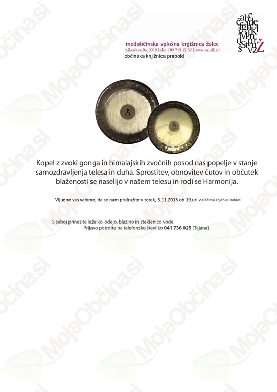 Vabimo vas, da se nam pridružite v torek, 3. novembra 2015, ob 19. uri v Občinski knjižnici Prebold na zvočni kopeli z gongom.