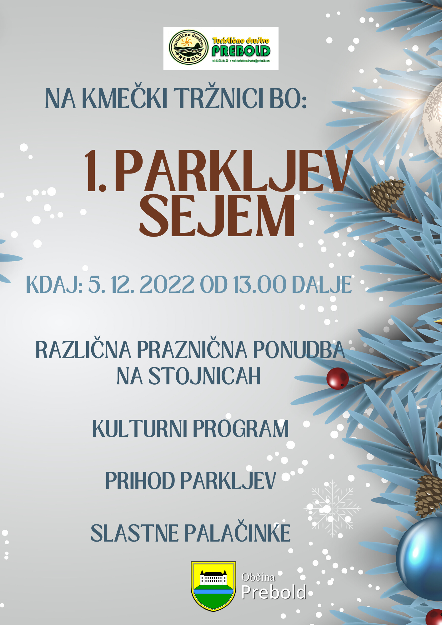 Turistično društvo Prebold vas vabi na 1. parkljev sejem, ki bo potekal v ponedeljek, 5. decembra 2022 od 13.00 dalje na prostoru Kmečke tržnice Prebold v Dolenji vasi.