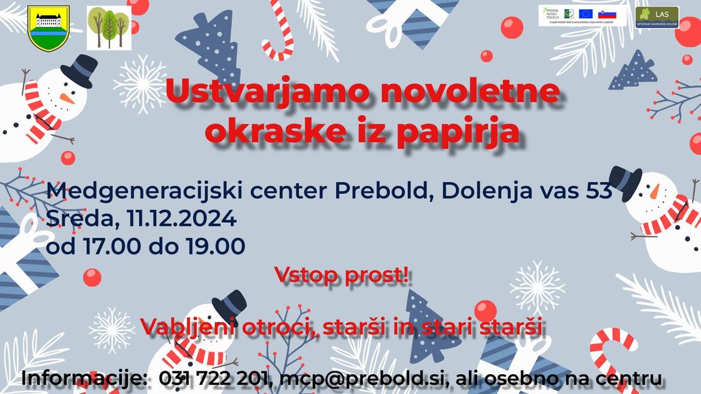 Vabimo vas, da se nam pridružite na ustvarjalni delavnici, kjer bomo izdelovali novoletne okraske iz papirja.