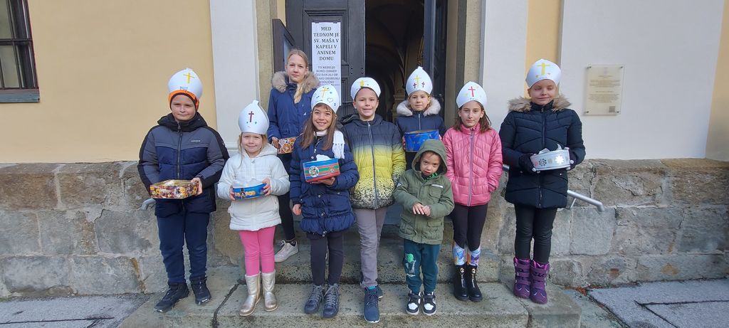 skromnim darilom in z voščilnicami, ki so jih izdelovali otroci pri verouku.