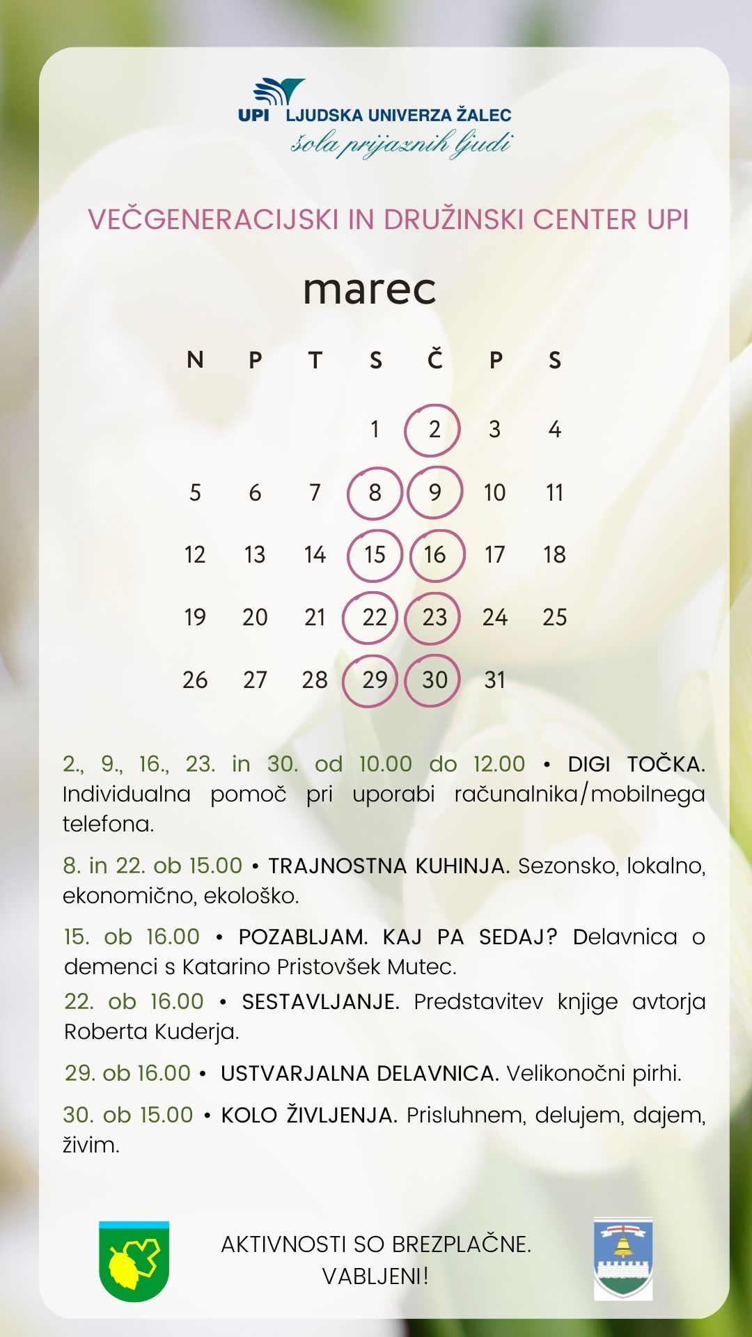 Vabljeni na številne aktivnosti in delavnice v okviru Večgeneracijskega in družinskega centra UPI v mesecu marcu.
