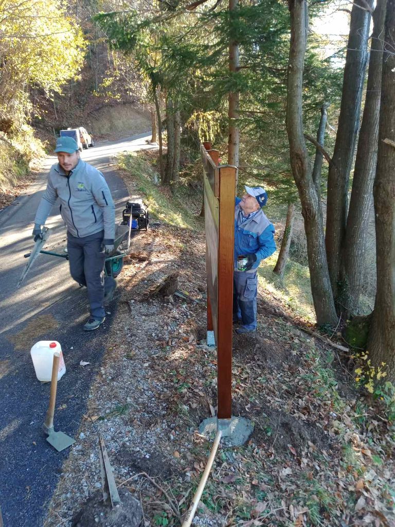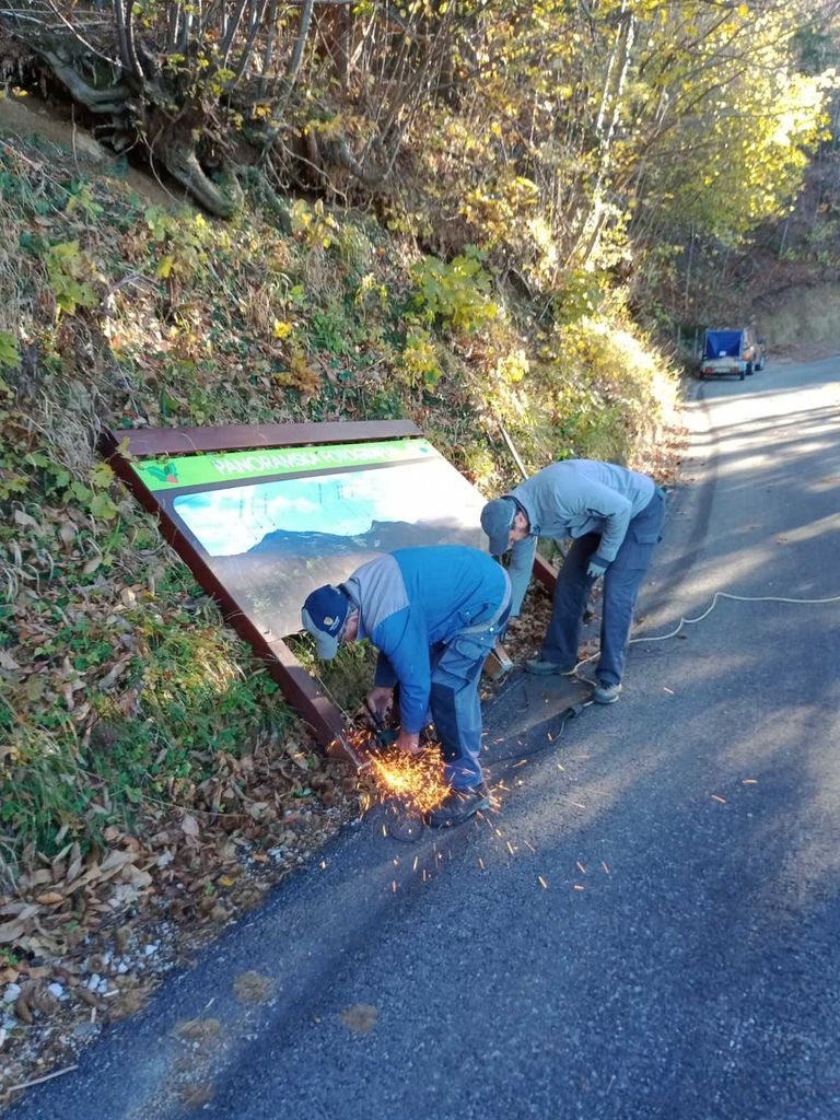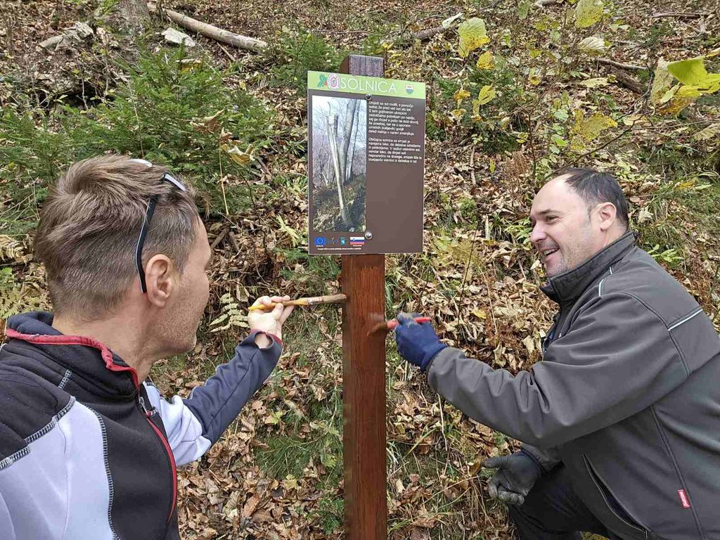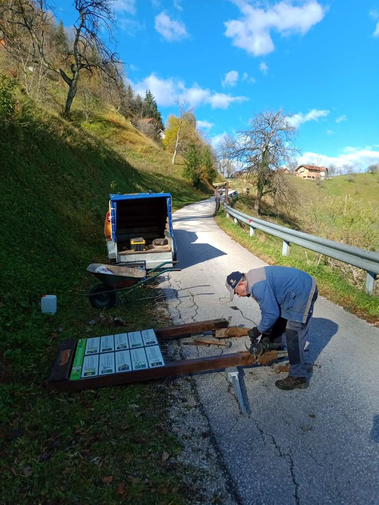Prva skupina se je podala na popravilo, postavitev in barvanje stebrov, tabel na Krožni učni poti Bodika.