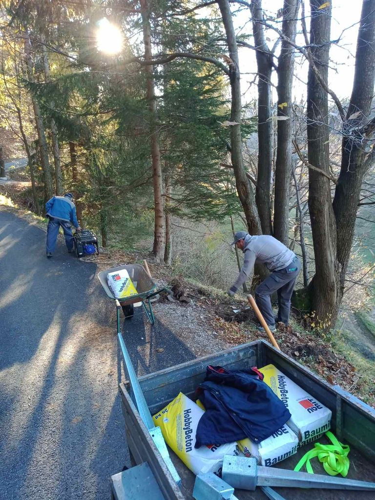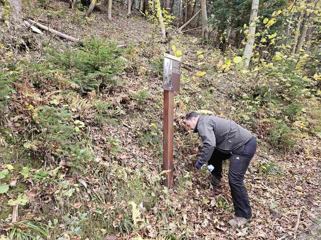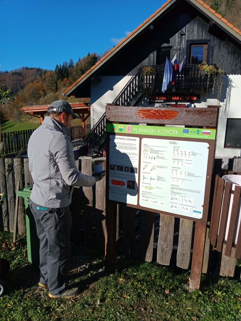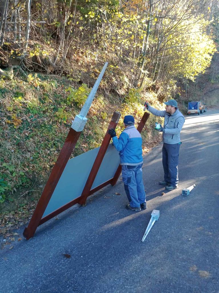 Prva skupina se je podala na popravilo, postavitev in barvanje stebrov, tabel na Krožni učni poti Bodika.