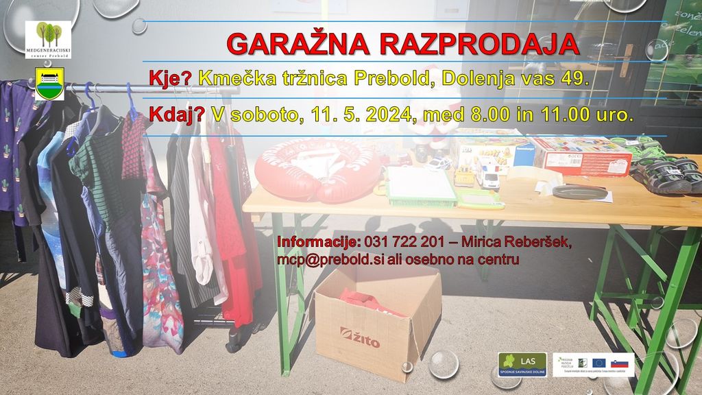 Na kmečki tržnici v Preboldu bo v soboto, 11. 5. 2024, med 8.00 in 11.00 uro garažna razprodaja.