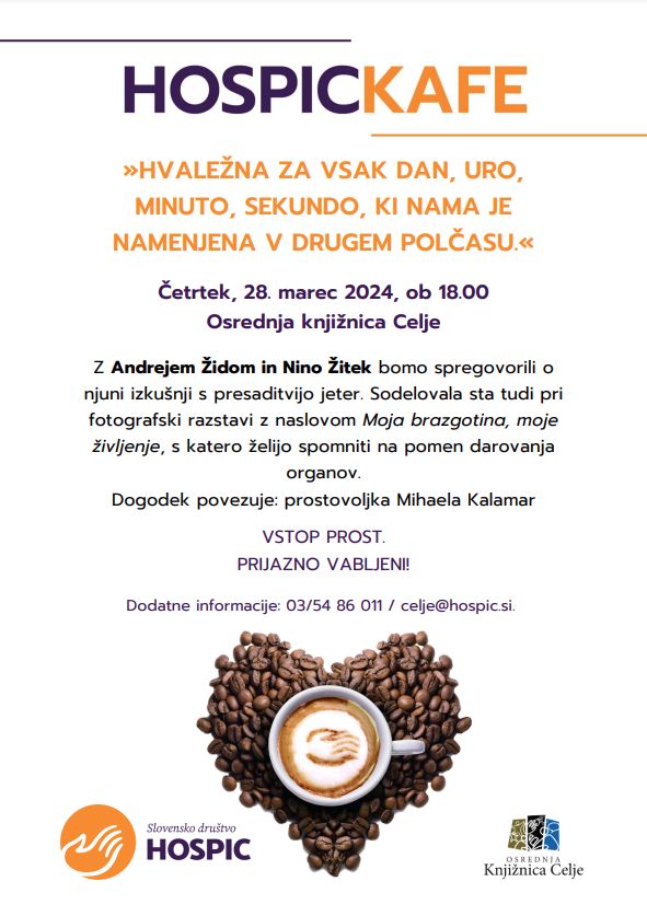 Slovensko društvo Hospic vabi v četrtek, 28.3.2024 ob 18.00 uri v Osrednjo knjižnico Celje na pogovor z Andrejem Židom ter Niko Žitek o njuni izkušnji s presaditvijo jeter.