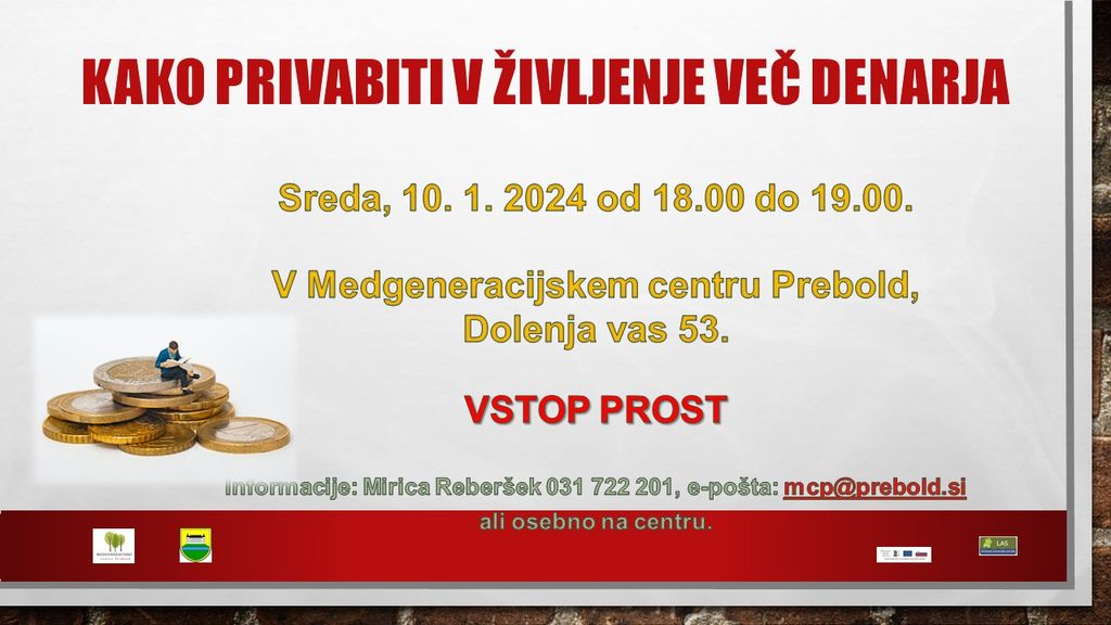V sredo, 10. 1. 2024 od 18.00 do 19.00 ure, je v Medgeneracijskem centru Prebold zelo zanimiva delavica, ki govori o našem razmišljanju o denarju.