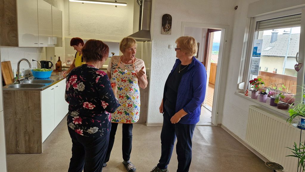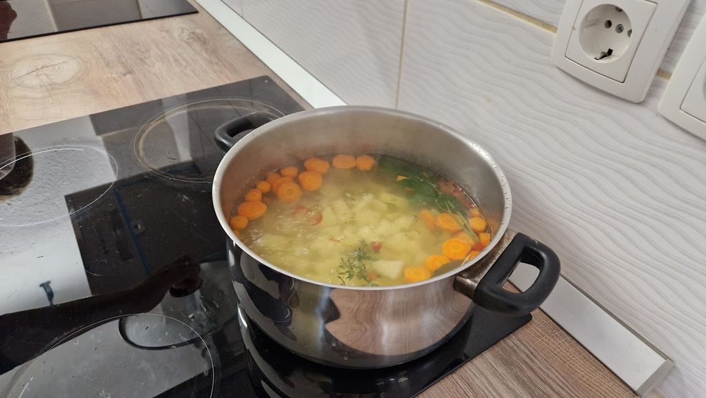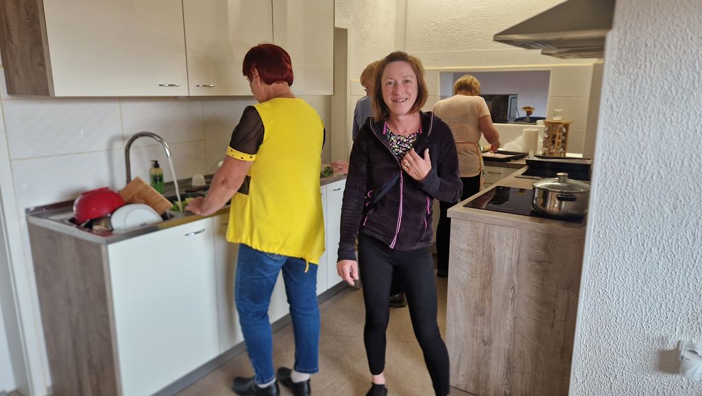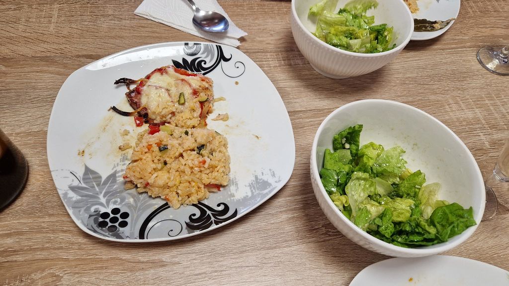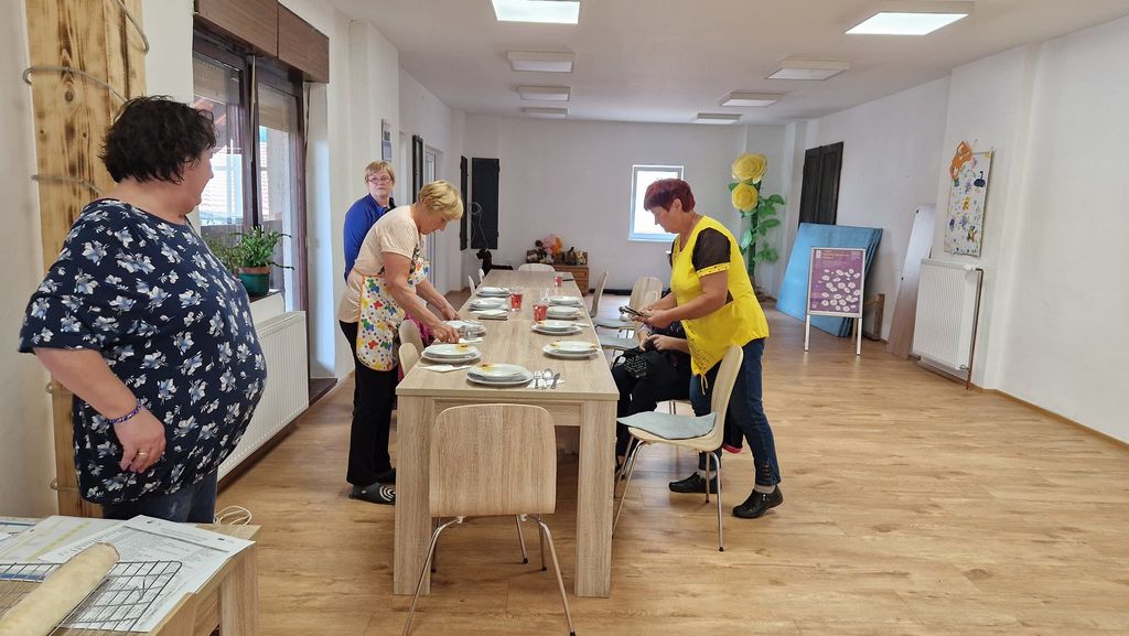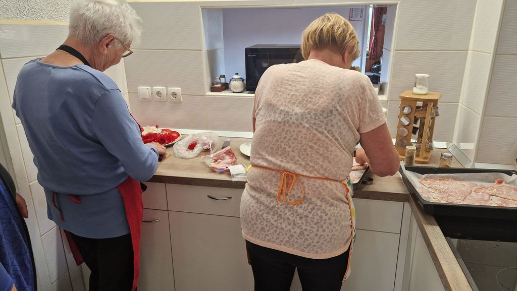Tokrat smo pripravljali obložene puranje zrezke, zelenjavni riž, solato, ki jo velikokrat prinese Marija, tokrat jo je prinesla Anica, in zeliščno juho. Vsakdo prispeva k pripravi po svojih zmožnostih in željah: nekateri kuhajo, drugi sekljajo, tretji pomagajo. Seveda pripravimo mizo, pogrinjke.