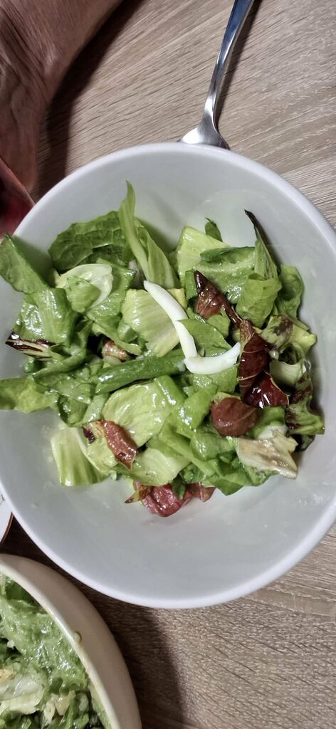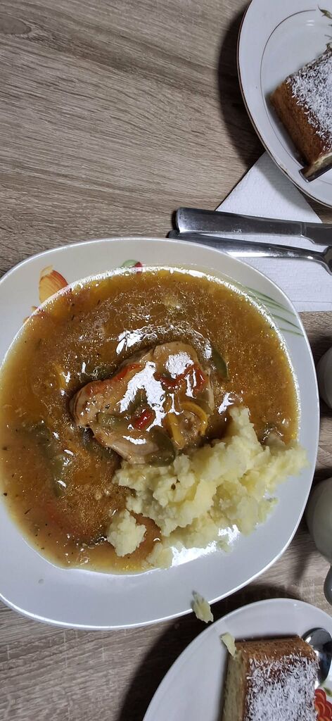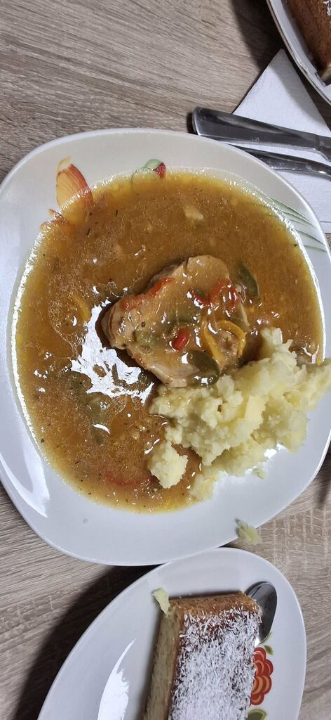 Nato smo zavihale rokave in se lotile priprave okusnega kosila. Na naših krožnikih so zadišali zrezki v omaki z zelenjavo, pražen krompir in sveža solata, ki jo je prinesla Marija.