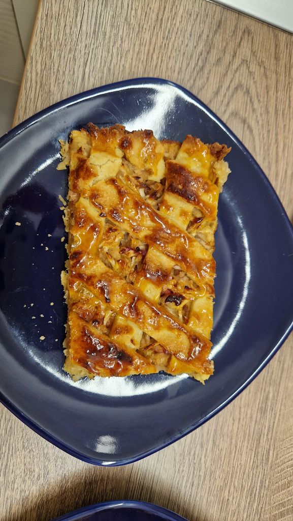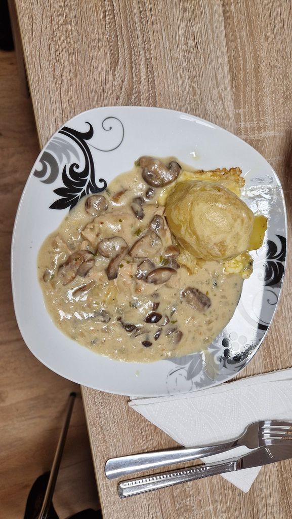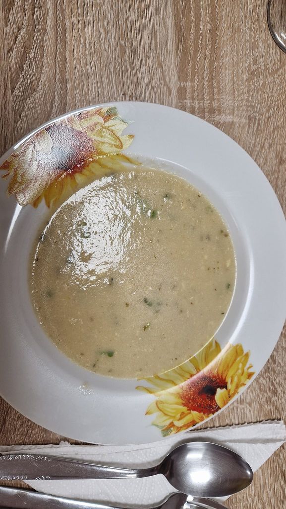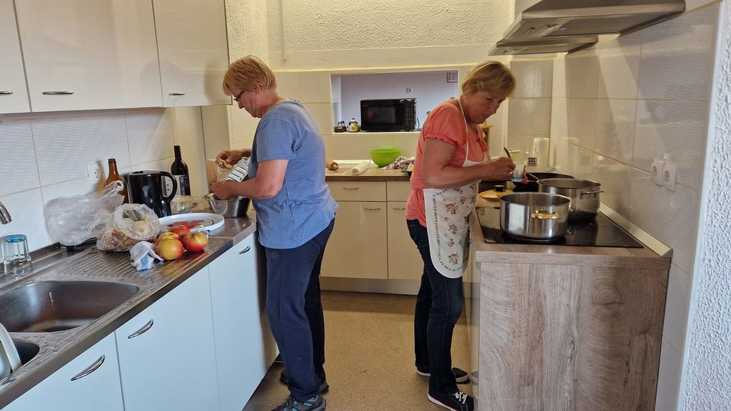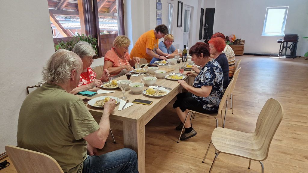 Iz sestavin, ki smo jih imeli v hladilniku ali zamrzovalniku, in z nekaj dodatki, ki smo jih dokupili, smo pripravili okusne puranje zrezke v smetanovi omaki. Poseben krompir iz pečice, pripravljen z maslom in sirom, je dopolnil jed. Solato nam vedno priskrbita Marija ali Anica, katera jo ima več doma. Za juho smo pripravili prežganko, ki je pod spretno roko Ljubice in z zelišči, ki rastajo pred centrom dobila prav poseben okus. Za sladico smo pripravili klasično jabolčno pito iz linškega testa.