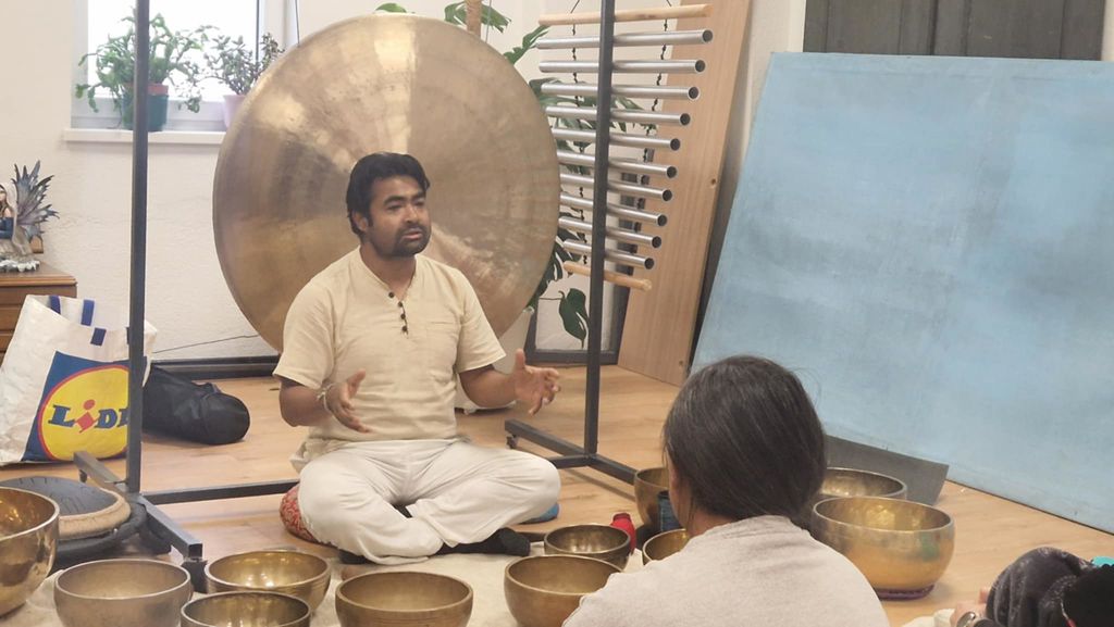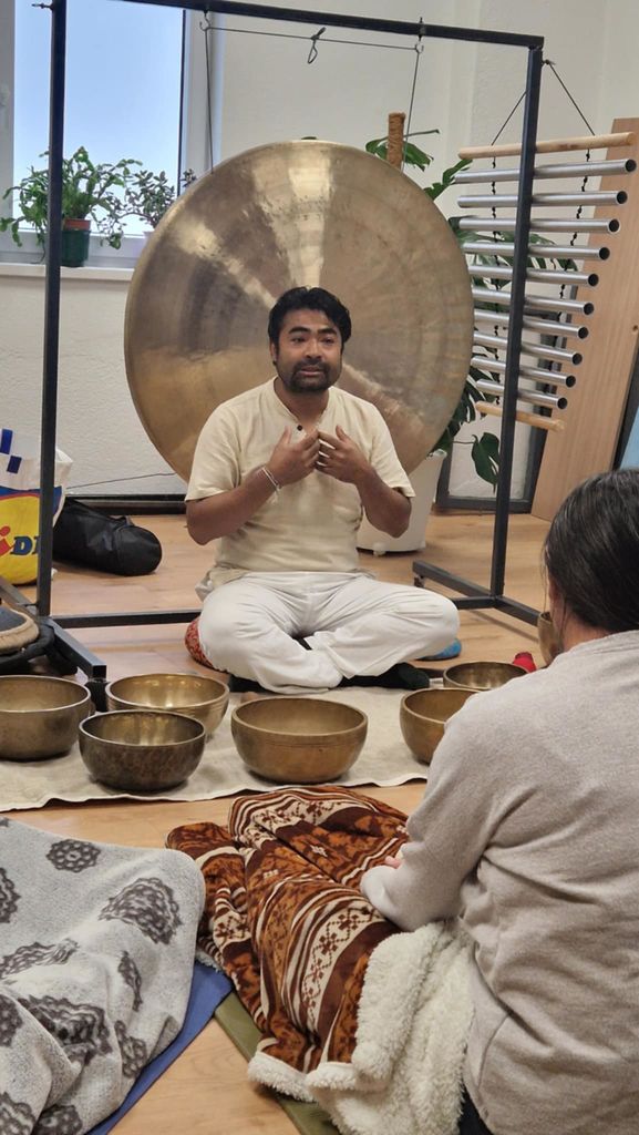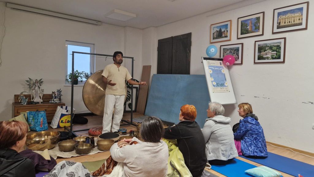 Podrobno nam je razložil pomen različnih tibetanskih posod, gonga in harfe ter njihovo vlogo pri sproščanju in harmonizaciji telesa in duha. Izvedeli smo, zakaj je zvočna kopel tako pomembna in kako blagodejno vpliva na naše počutje.