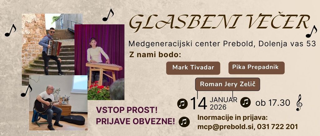 Vljudno vabljeni na čudovit glasbeni večer, ki bo v sredo, 14. januarja 2026, ob 17.30 v Medgeneracijskem centru Prebold, Dolenja vas 53.