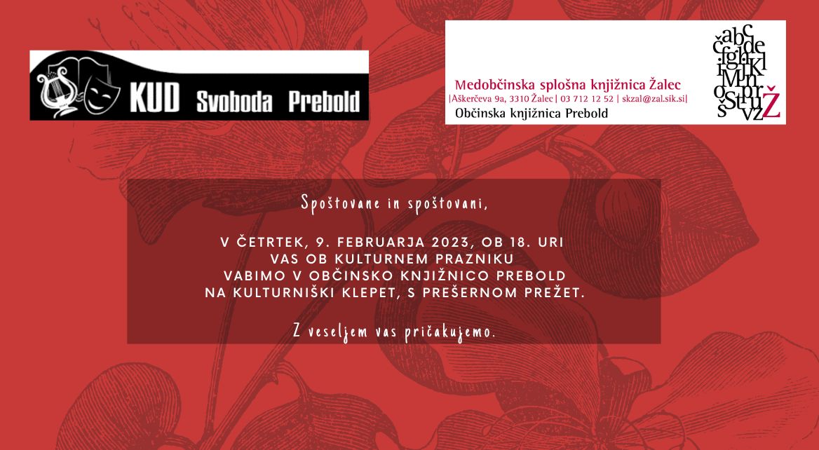 V četrtek, , 9. februarja 2023, ob 18. uri, vas vabimo v Občinsko knjižnico Prebold na literarni večer ob kulturnem prazniku.