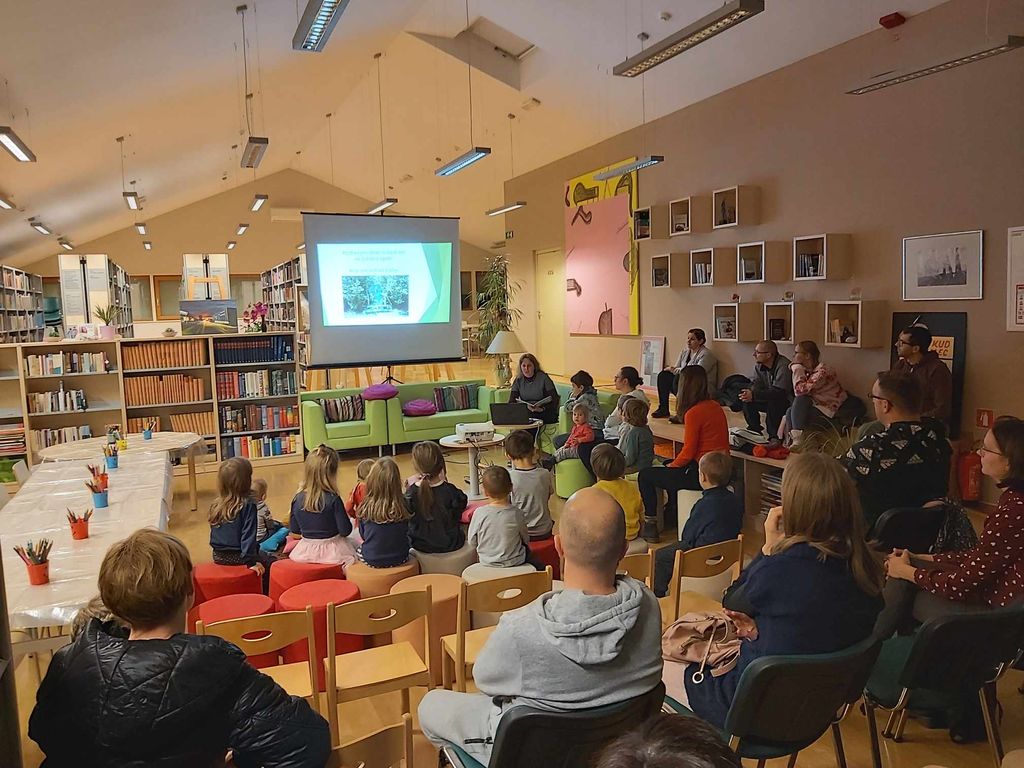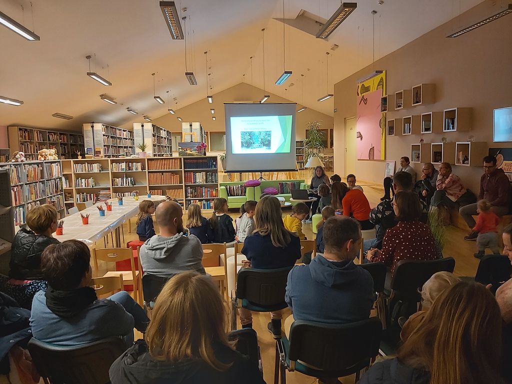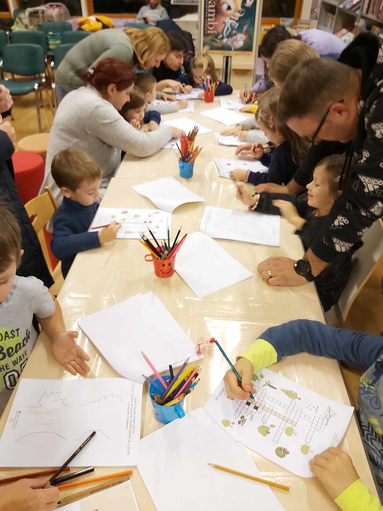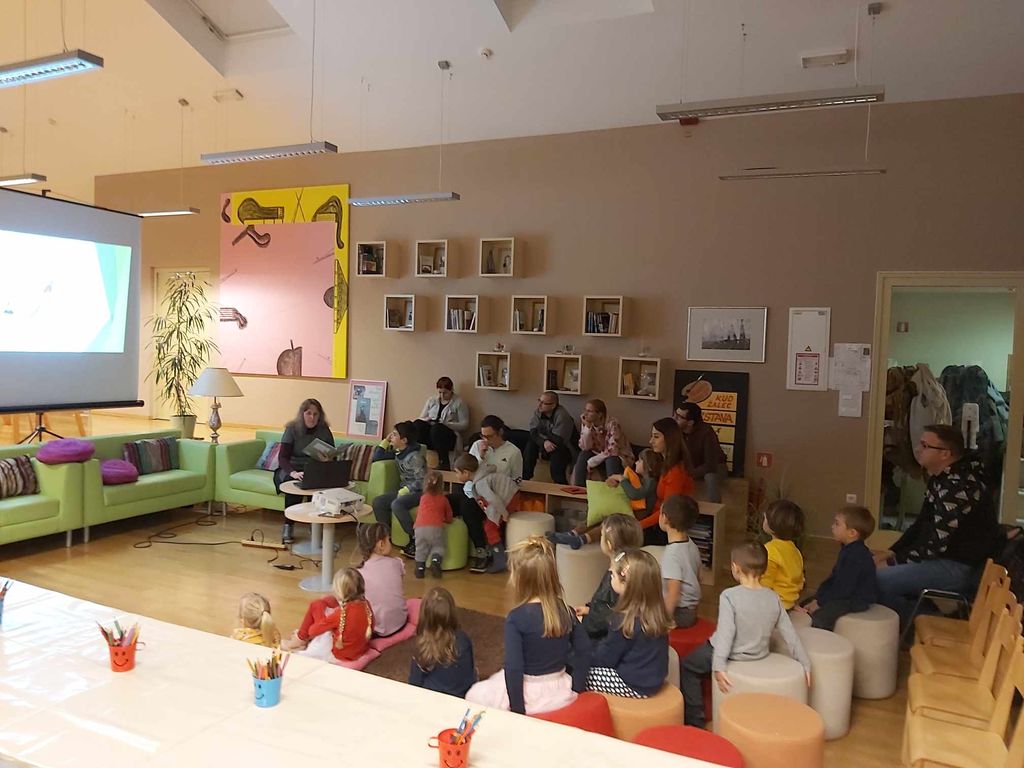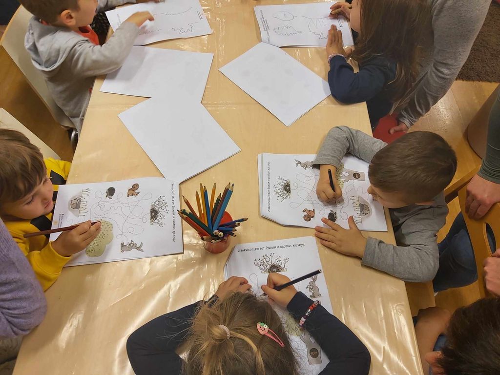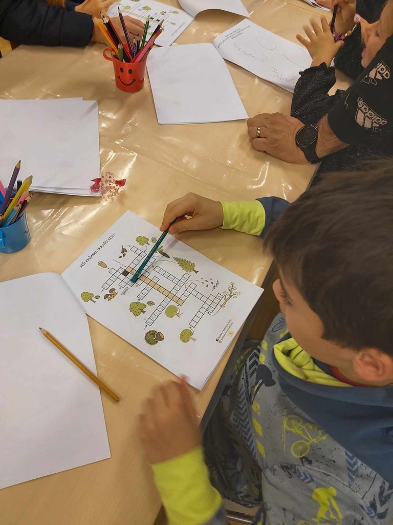 Zgodba je govorila o živalih iz Rečnikove hoste, prek hrasta Srečka pa jo je interpretirala knjižničarka Lea Felicijan. Zvedavi mali nadobudneži so prisluhnili, kako je bilo, ko so se nekega dne pred zajčkovim brlogom zbrale gozdne živali. Povabile so ga na piknik, toda imel je veliko težavo, ki je nikakor ni znal rešiti. S skupnimi močmi so mu prijatelji pomagali, otroci pa so spoznali, da je najbolje, da kdaj pa kdaj zapustimo gozd, stečemo čez polje, nadaljujemo pot do bližnjega hriba, prečkamo potok … Pogovarjali smo se tudi ob ustvarjanju. Tokrat so otroci reševali gozdni kratkočasnik s prikupnimi zagonetkami v obliki križank in labirinta, iskali so skrito geslo, povezovali sličice, poimenovali gozdne plodove, na koncu jih je sled pripeljala celo do ugotovitve, kje živali spijo.