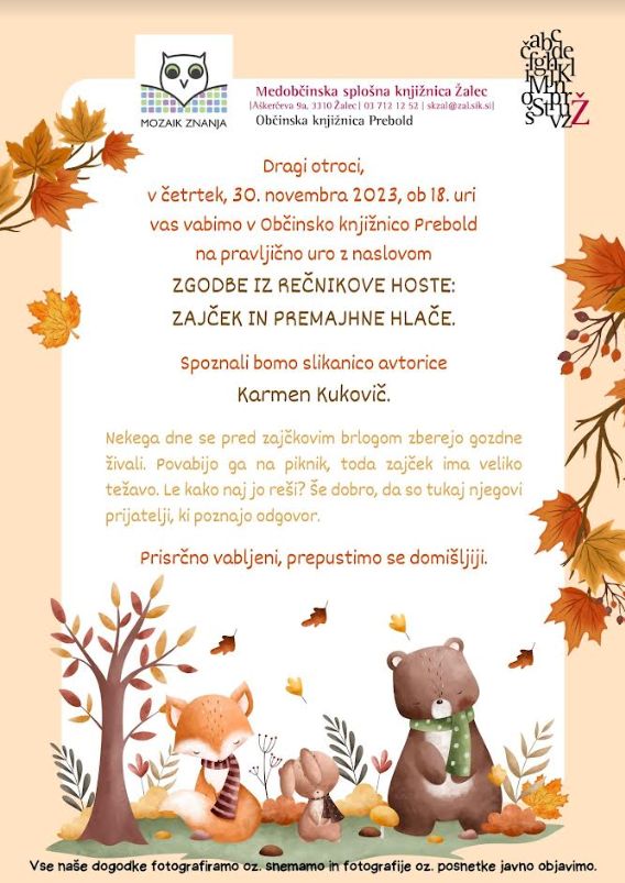 V četrtek, 30. novembra 2023 ob 18.00 uri vabljeni v Občinsko knjižnico Prebold na pravljično uro z naslovom Zgodbe iz rečnikove hoste: Zajček in premajhne hlače.