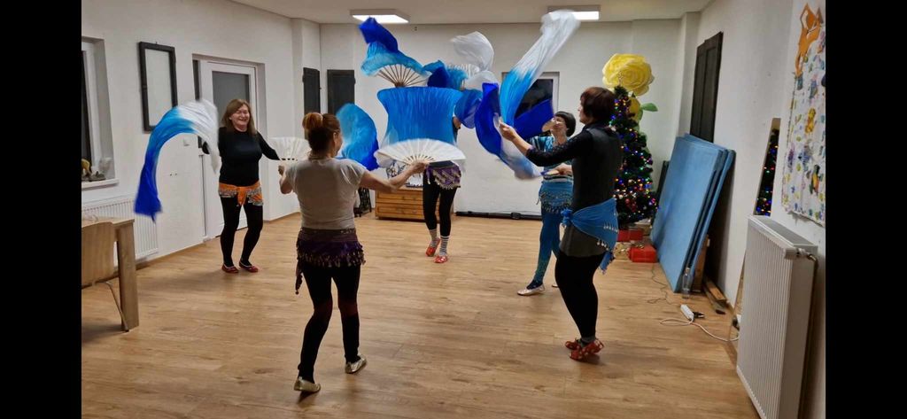 Na vajah uživamo v prijetnem vzdušju, ob gibih pa krepimo telo in duha. Tokrat nas je naša vaditeljica Darja na novo učila plesati z orientalskimi pahljačami.