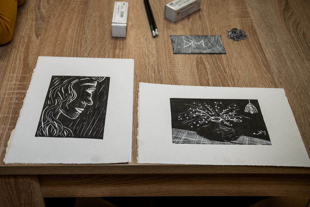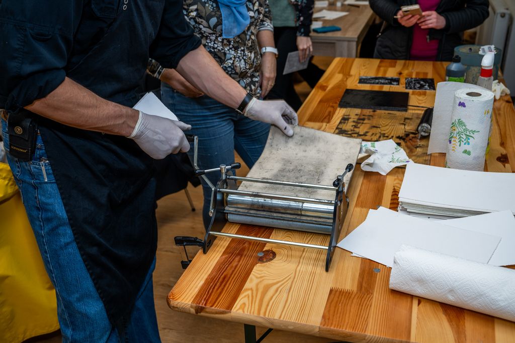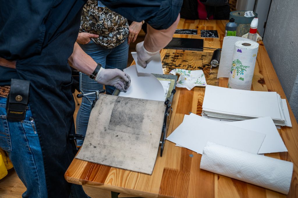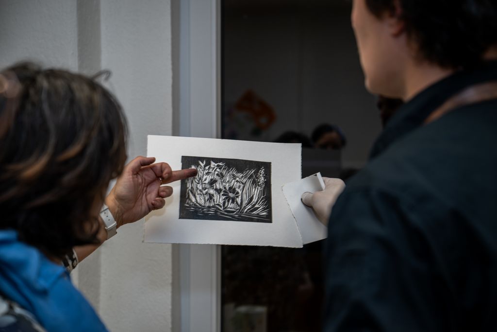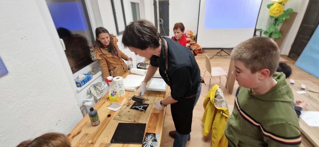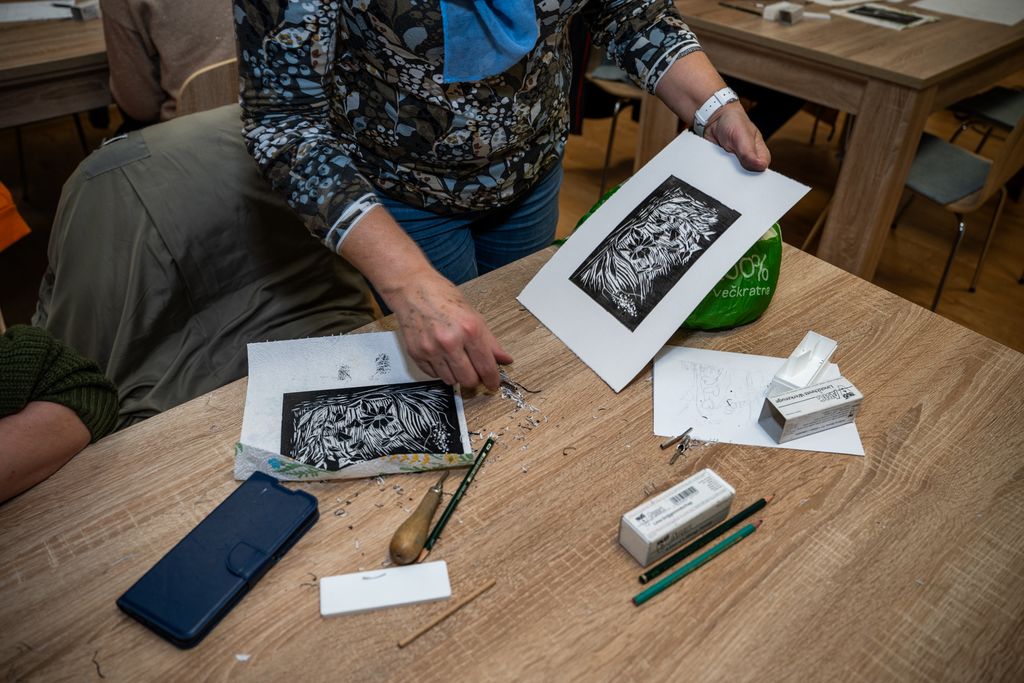 V prvem delu smo se potopili v fascinantni svet linoreza in lesoreza. Miha Erič nas je popeljal skozi čarobni svet tehnik, razkrivajoč nam skrivnosti dolžine potegov, globine rezov in vpliva različnih likov na končni odtis na papirju. Vsaka gesta, vsak rez je bil poglobljena študija, ki je razkrivala moč umetnosti.
