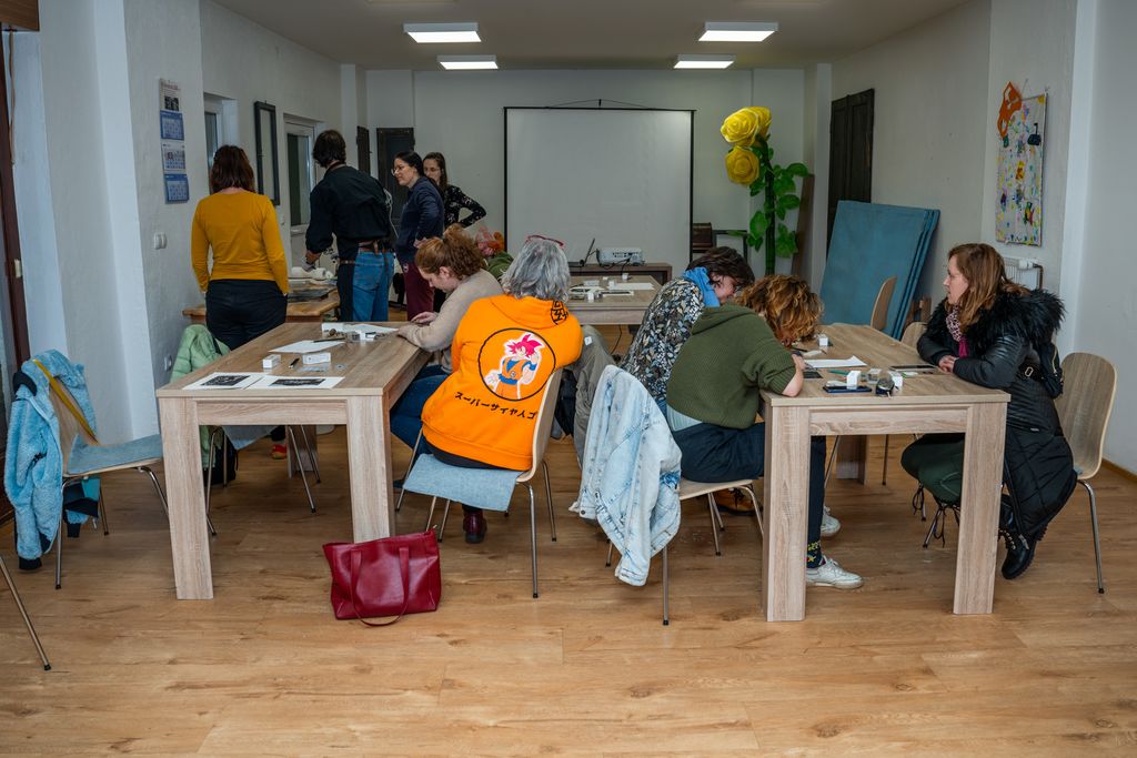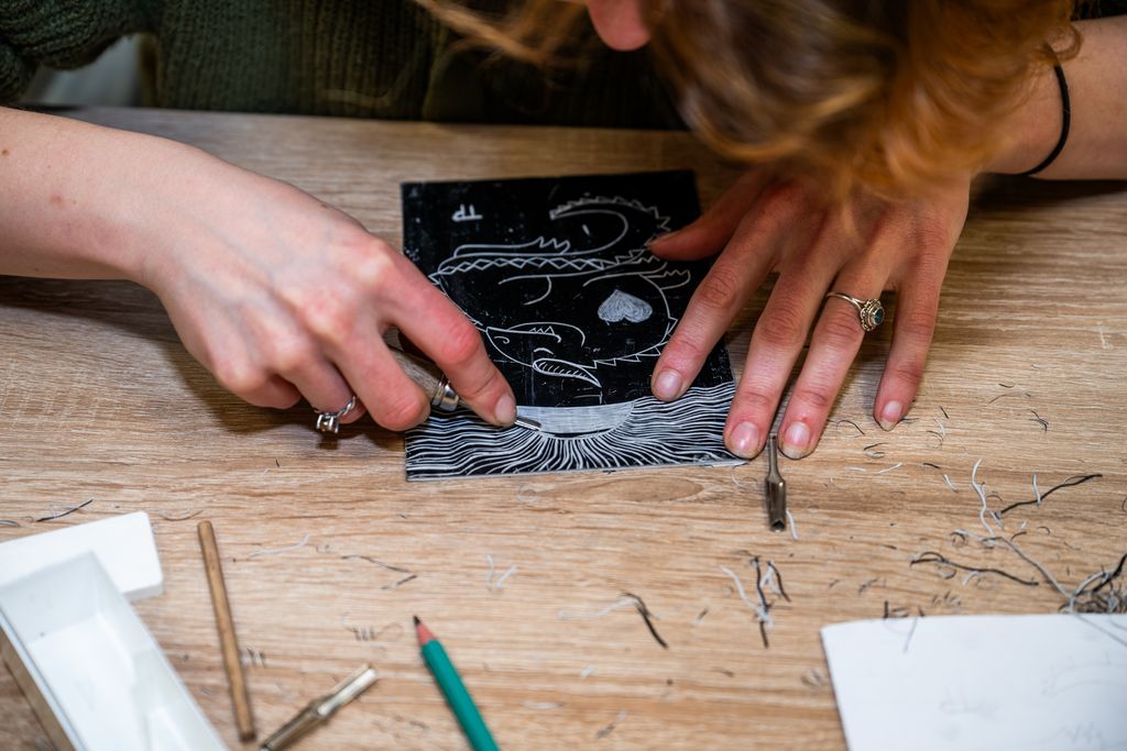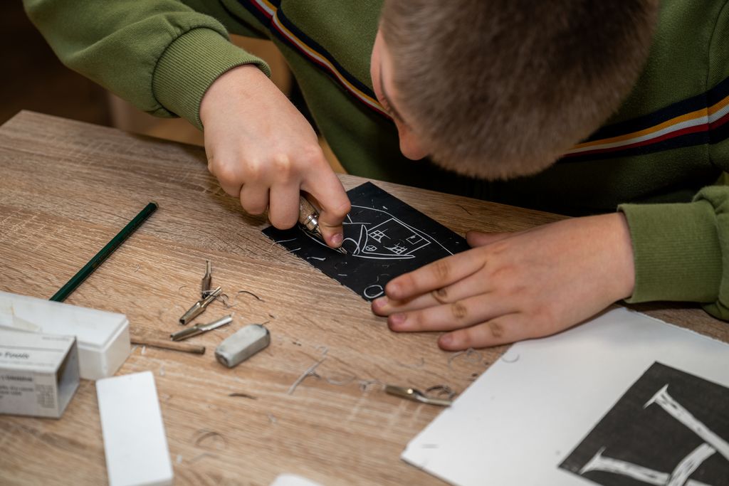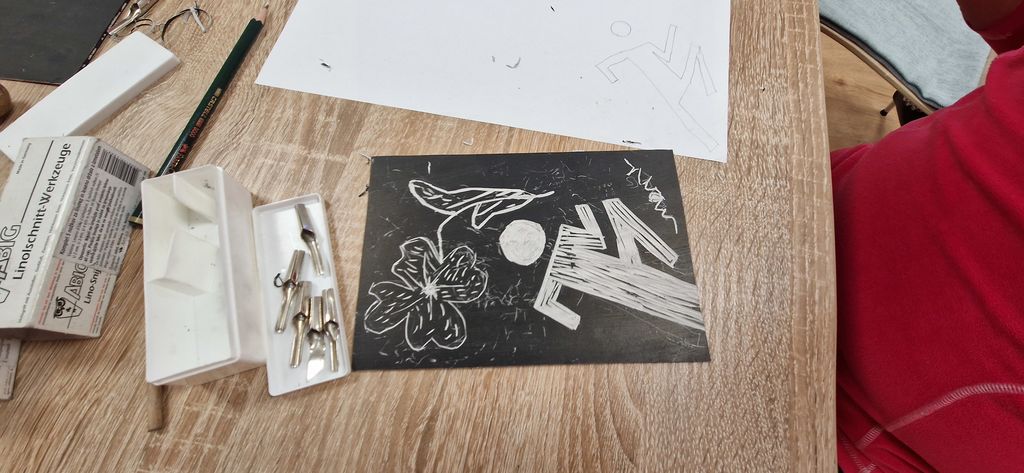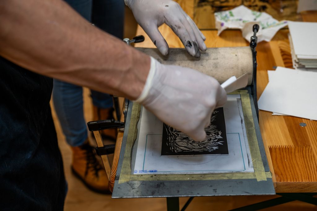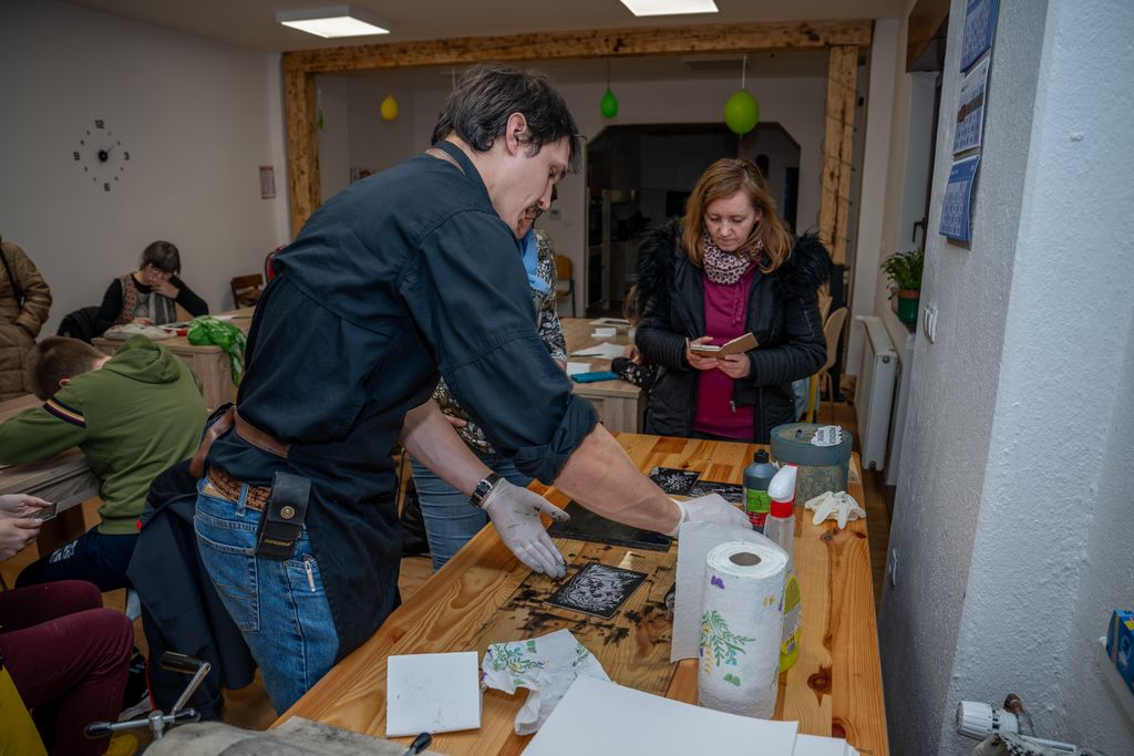 V prvem delu smo se potopili v fascinantni svet linoreza in lesoreza. Miha Erič nas je popeljal skozi čarobni svet tehnik, razkrivajoč nam skrivnosti dolžine potegov, globine rezov in vpliva različnih likov na končni odtis na papirju. Vsaka gesta, vsak rez je bil poglobljena študija, ki je razkrivala moč umetnosti.