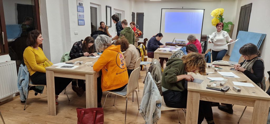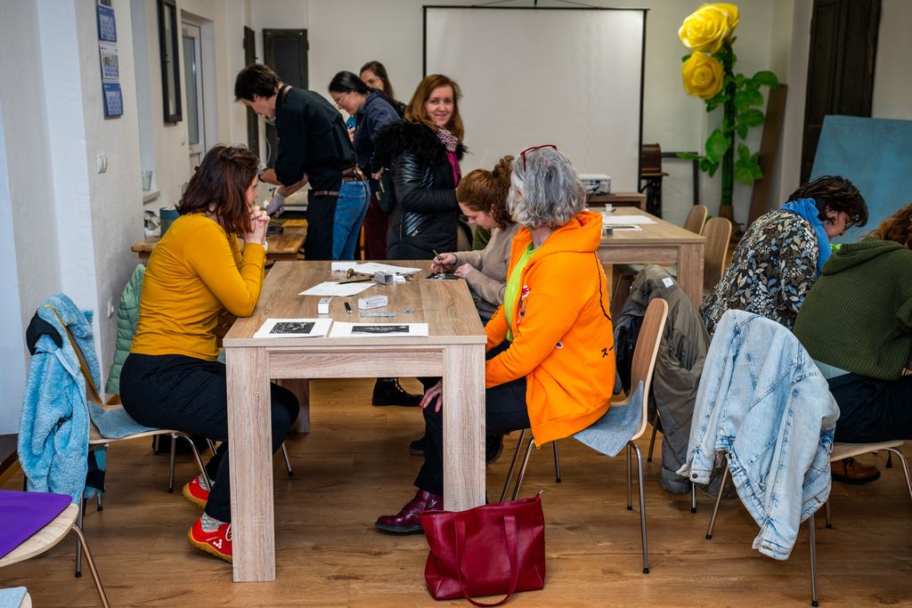 V drugem delu smo se prelevili v prave ustvarjalce. Mest je bilo samo 12, ker je bilo na razpolago toliko kompletov nožkov, ki so potrebni za ustvarjanje.  Vsi smo se vrnili v čase osnovnošolskih dni, kjer smo s pristnim navdušenjem obujali spomine na ustvarjanje. A tokrat, so bile naše stvaritve prežete z umetniškim duhom. Vsak odtis je bil unikaten in delo neponovljivega trenutka.
