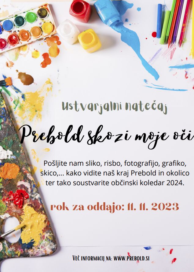 Z natečajem želimo prebivalcem občine Prebold omogočiti, da s svojimi deli sodelujejo in pripomorejo k ustvarjanju občinskega koledarja za leto 2024. Za vsak mesec bomo izbrali eno delo ter ga natisnili v občinskem koledarju.