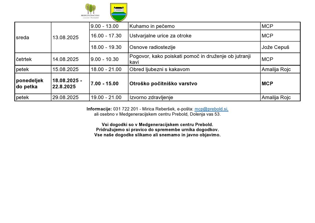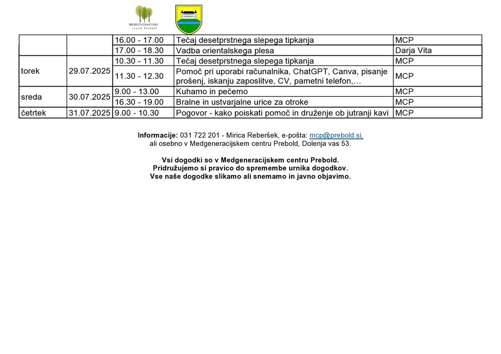 Informacije: 031 722 201, mcp@prebold.si