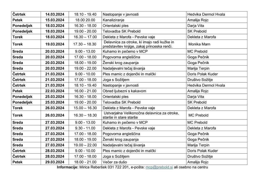 Informacije: Mirica Reberšek - 031 722 201, e-pošta: mcp@prebold.si ali osebno na centru.
