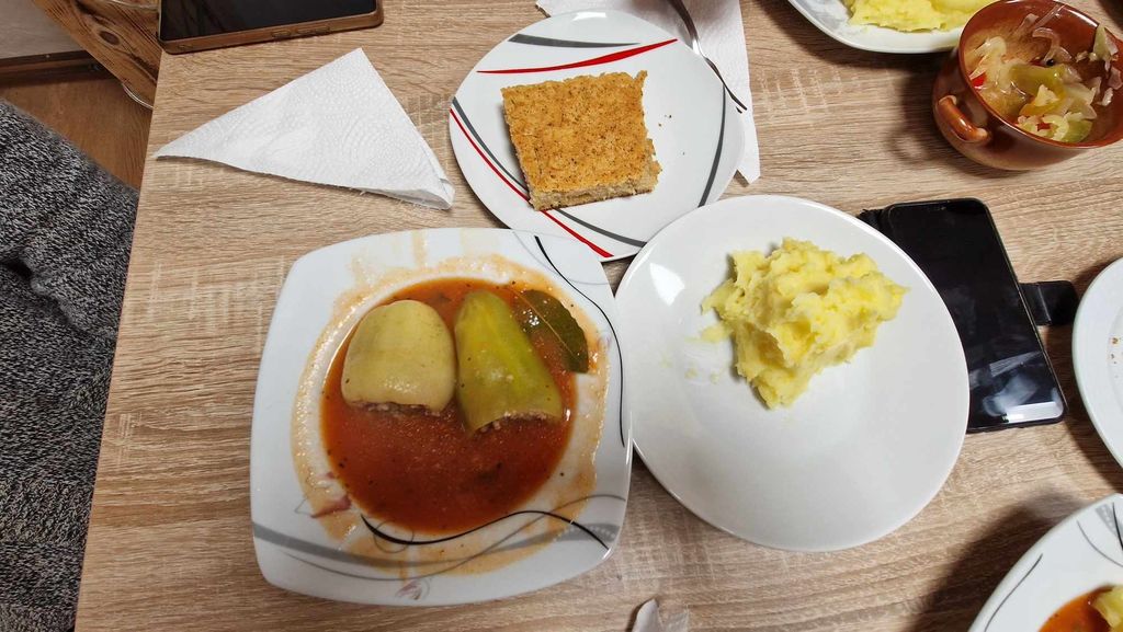 Pripravile smo slastne polnjene paprike z mletim mesom in pire krompir. Paprike je z veseljem prinesla kuharica Ana, za sladico pa nas je razveselila Rozalija s čudovitim pecivom iz jabolk, ki jih je naša kuharica Marija z veseljem prinesla.