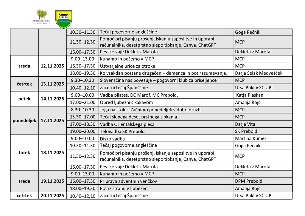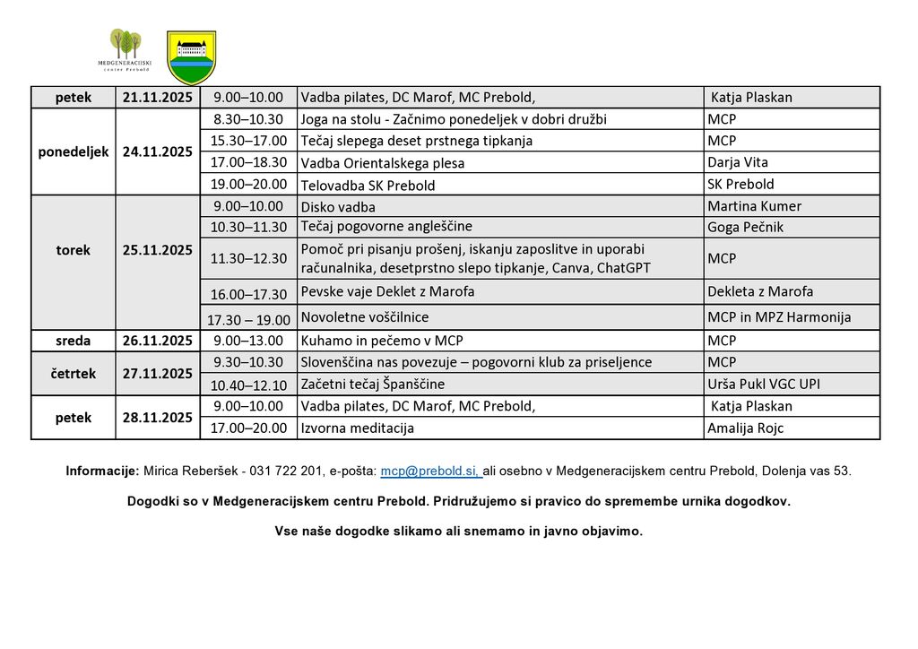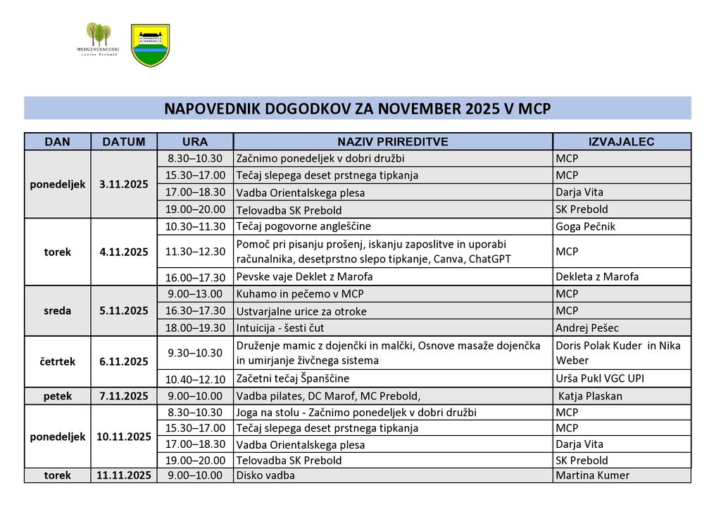 Mesečni program Medgeneracijskega centra Prebold, za mesec NOVEMBER 2025