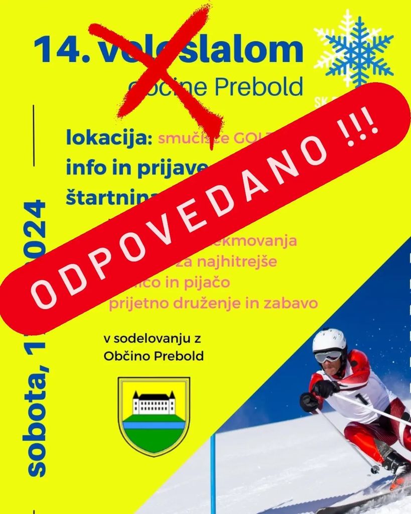 Smučarski klub Prebold obvešča, da so bili zaradi slabih snežnih razmer, primorani odpovedati veleslalom občine Prebold, v soboto 17.2.2024.