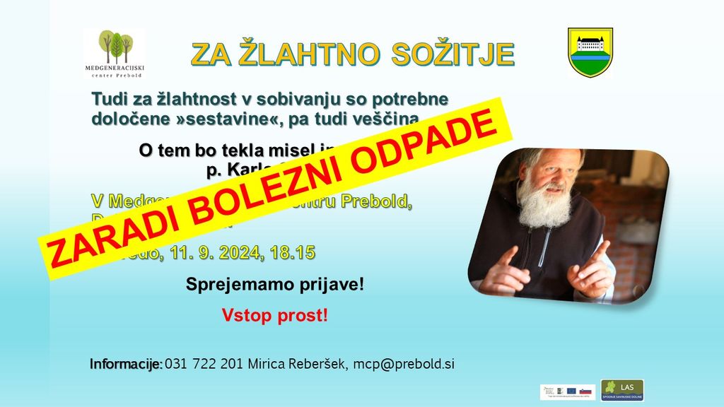 Žal vas moramo obvestiti, da danes, v sredo, 11. 9. 2024, zaradi bolezni p. Karla Gržana predavanje ODPADE.