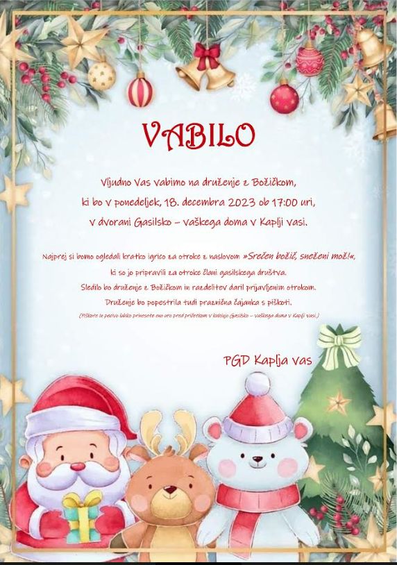 PGD Kaplja vas vabi na druženje z Božičkom, ki bo v ponedeljek, 18. 12. 2023 ob 17.00 uri v dvorani gasilsko-vaškega doma v Kaplji vasi.