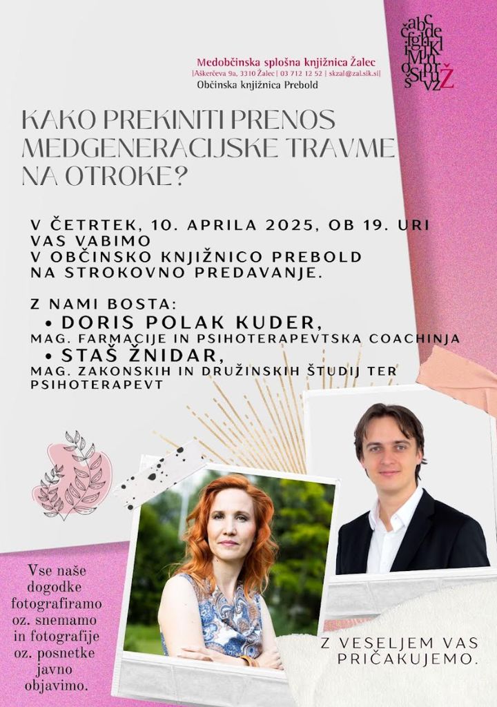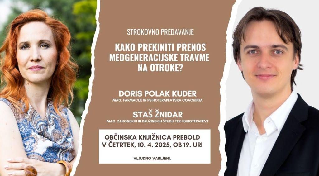 vas zanima, kako prekiniti prenos medgeneracijske travme na otroke? O tem bosta spregovorila dva psihoterapevta, Doris Polak Kuder in Staš Žnidar. Vljudno vabljeni v Občinsko knjižnico Prebold v četrtek, 10. aprila 2025, ob 19. uri.