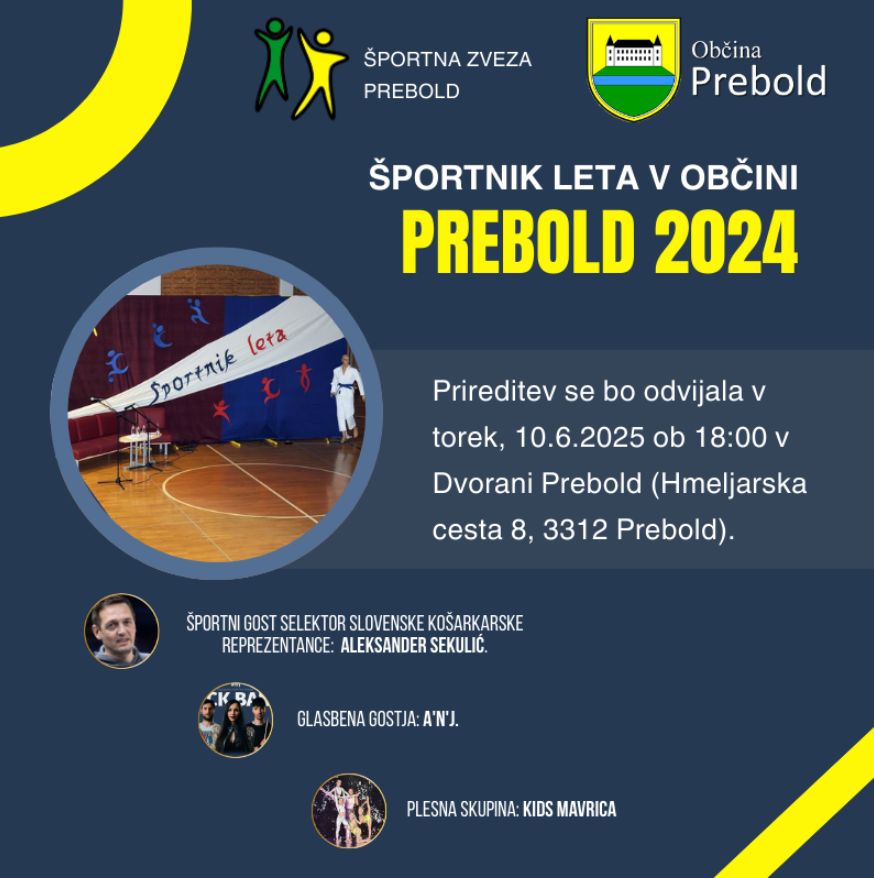 Vljudno vabljeni na prireditev ŠPORTNIK LETA, ki bo v torek, 10. 6. 2025 s pričetkom ob 18.00, v Dvorani Prebold (Hmeljarska cesta 8, 3312 Prebold).