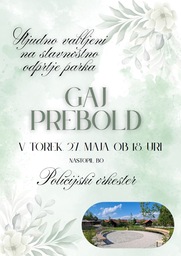 Vljudno vas vabimo na Slavnostno odprtje Gaja Prebold, ki bo v torek, 27. maja, ob 18. uri na prireditvenem prostoru v Gaju. Nastopil bo Policijski orkester.
